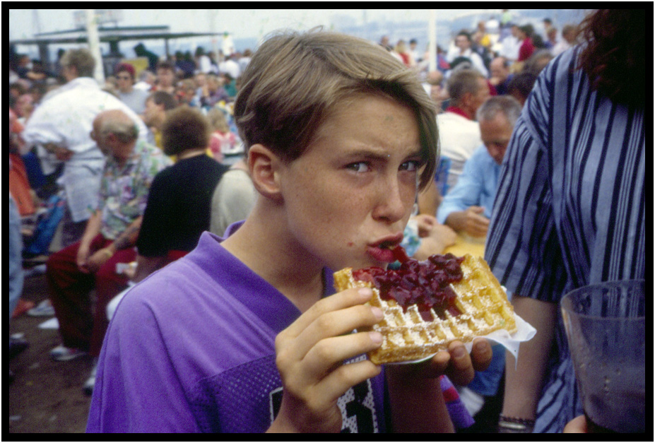 Simon Stolle enjoying a waffle, Kieler Woche, Kiel, Schleswig-Holstein, Germany, 1994.