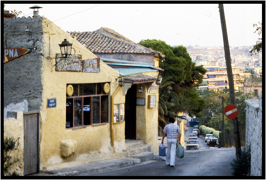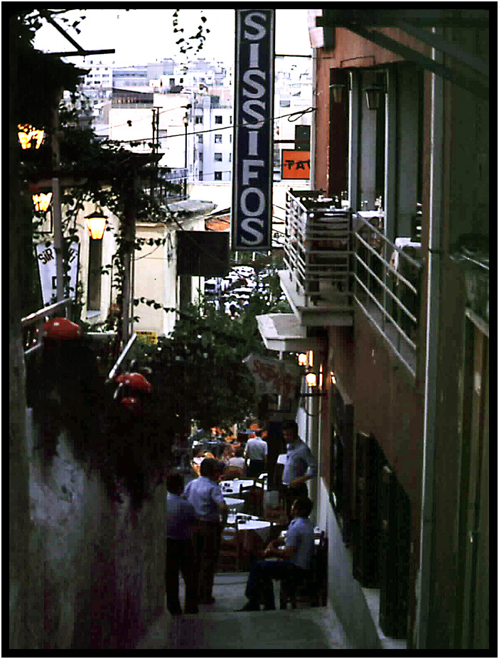 Tavernas on a steep back street below the Acropolis, Athens, Greece, 1978.