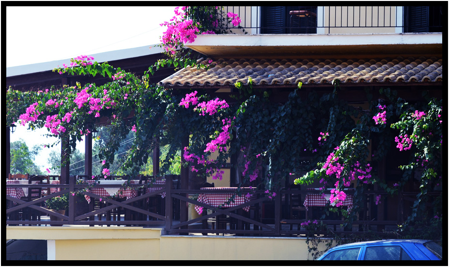 Beautiful flowers grace this patio Restaurant, Pelekas, Corfu, Greece, 2013.