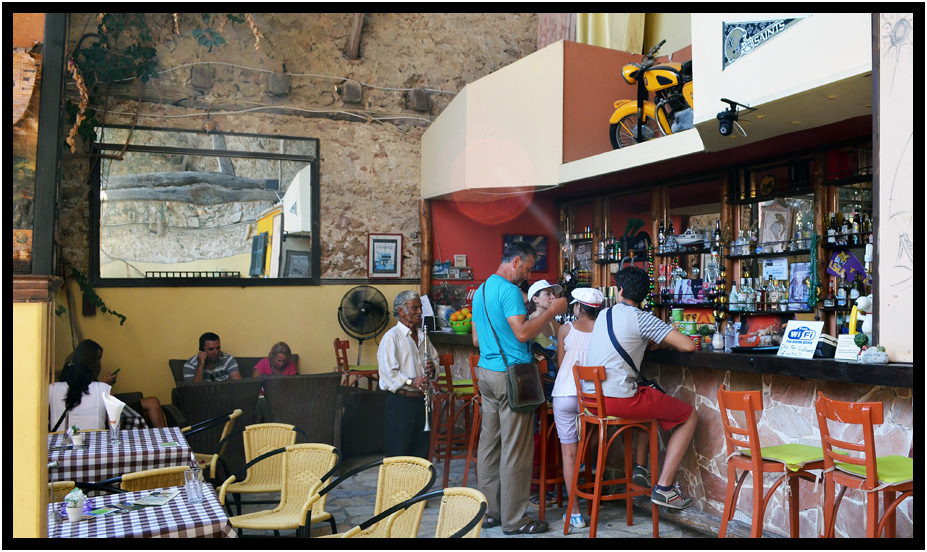 This tourist bar is part of the courtyard and featured a New Orleans Saints pennant and "short" live Greek music selections, Katakolon, Greece, 2013.