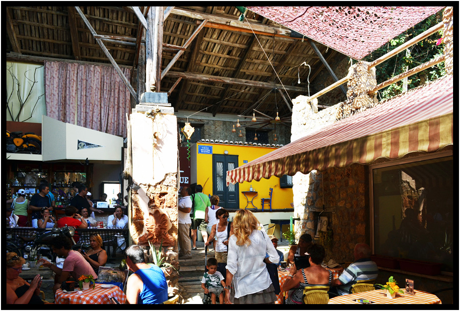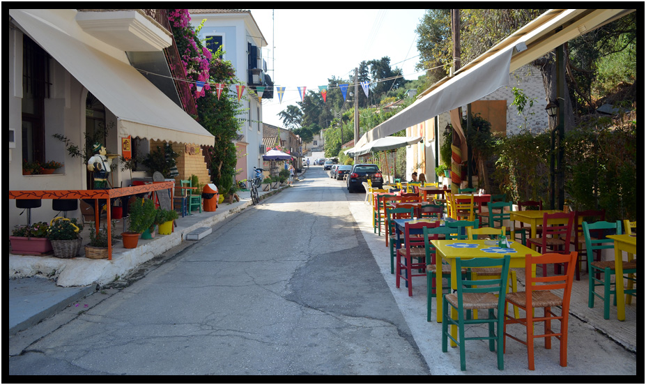 One block of the main street, this side street sidewalk cafe was peaceful and quiet, Katakolon, Greece, 2013.