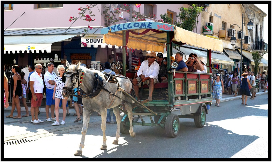 Other tourists choose to ride the horsecart down main street, Katakolon, Greece, 2013.