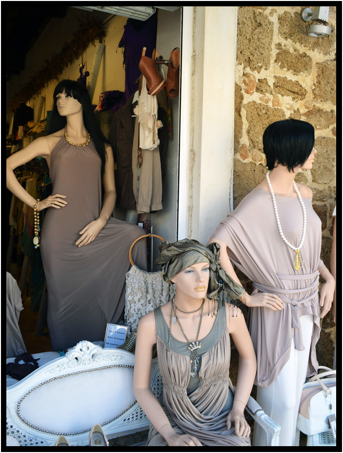 Latest in Greek fashion in front of a shop, Katakolon, Greece, 2013.