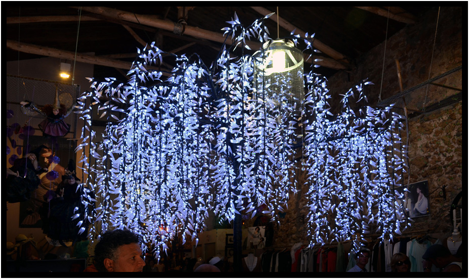 Snazzy art mobile on the ceiling of a shop, Katakolon, Greece, 2013.