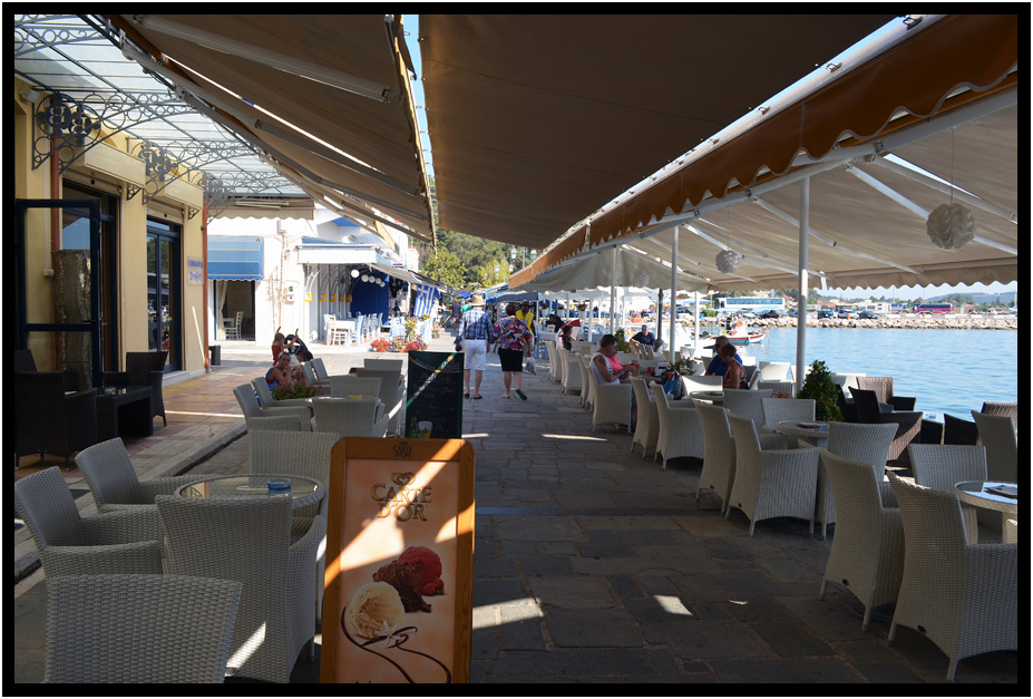 Carte d'Or cafe features wicker chairs at their waterfront cafe, Katakolon, Greece, 2013.