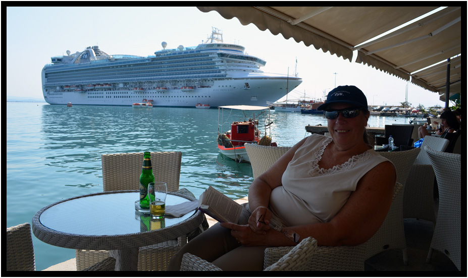 Lynn enjoying a beer at a waterfront cafe, Katakolon, Greece, 2013.