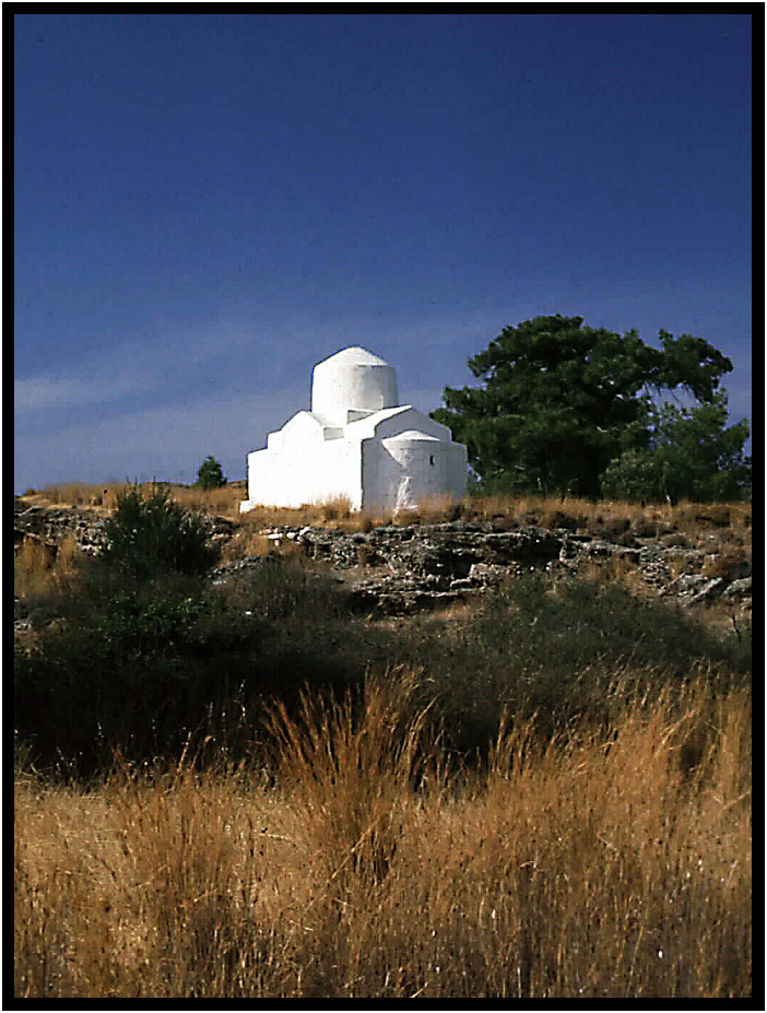 A white-washed chapel stands out against the rocky countryside, Rhodes, Greece, 1984.