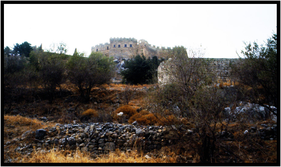 City wall and fortress as seen from the countryside, Rhodes, Greece, 1978.