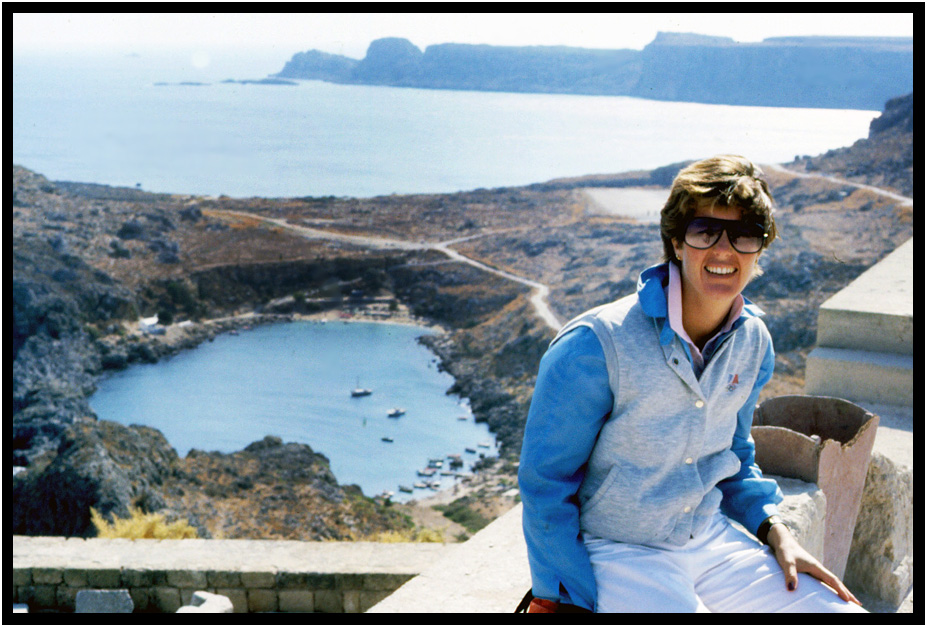 Travelling companion, Joyce, with coastline in background, Rhodes, Greece, 1984.