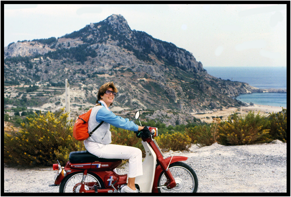 Joyce on one of the motorcycles we rented, Rhodes, Greece, 1984.