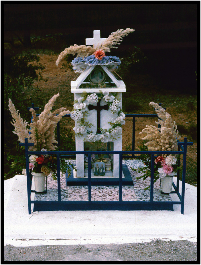 Private shrines are common sights along side country roadways in Rhodes, Greece, 1984.