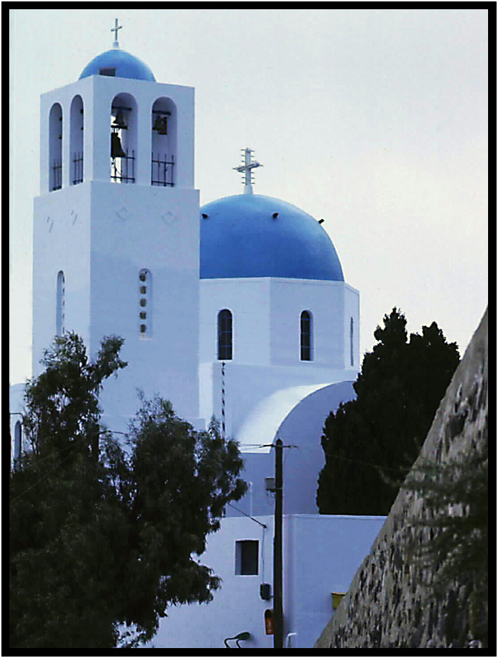 It sits high above the sea on the rim of the caldera of an ancient volcano."