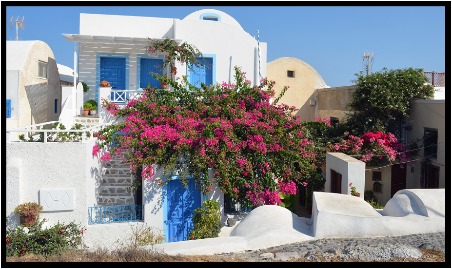Colorfull flowers are often a regional asset to homes, Oia, Santorini, Greece, 2013.