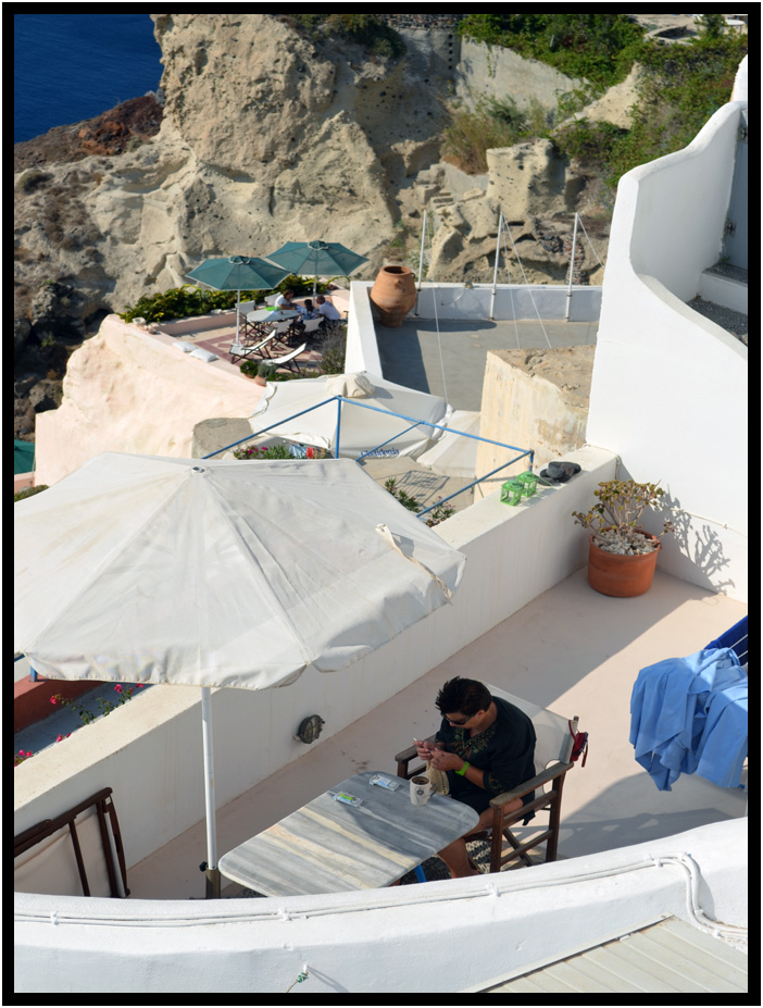 Almost every abode has at least a small outdoor patio from which to enjoy the elements, Oia, Santorini, Greece, 2013.