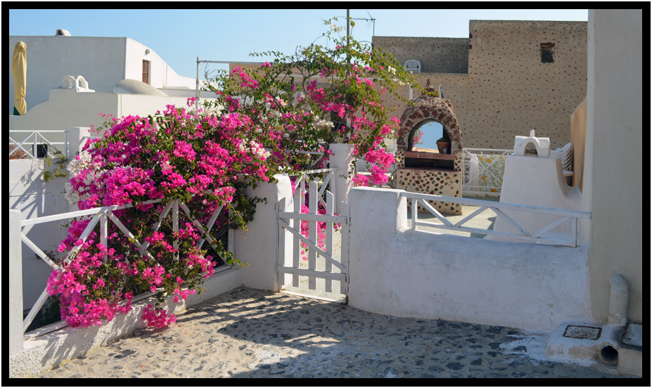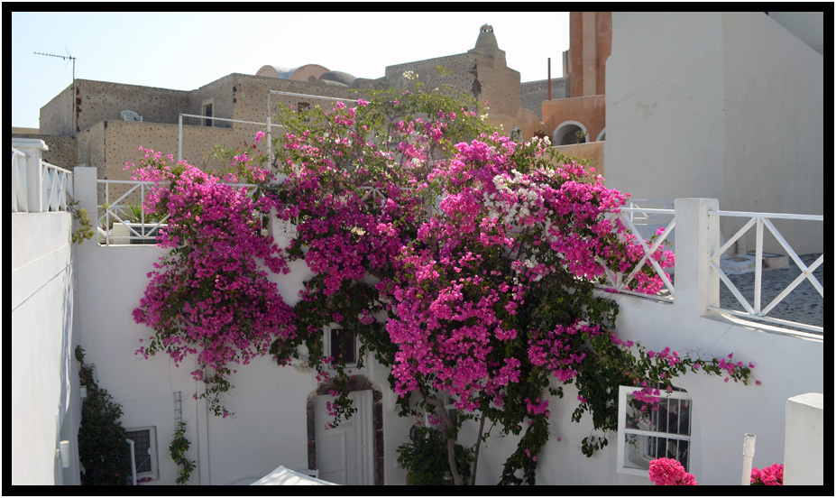 Climbing flowers in the Greek islands almost become an architectural element, Oia, Santorini, Greece, 2013.
