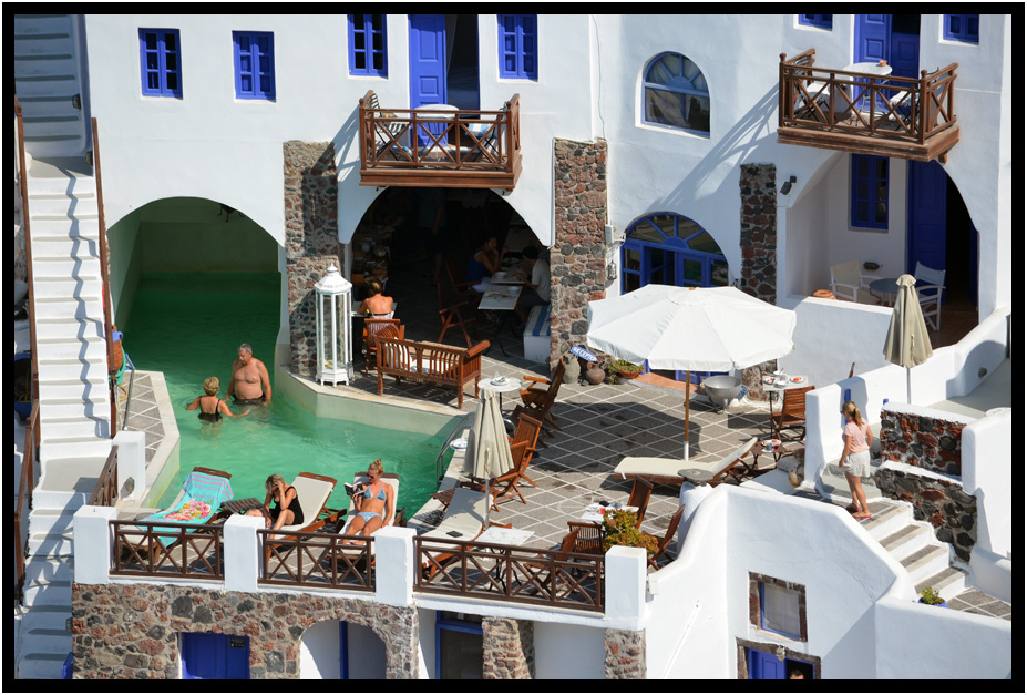 The quests at this hotel appear to be enjoying their holiday, Oia, Santorini, Greece, 2013.