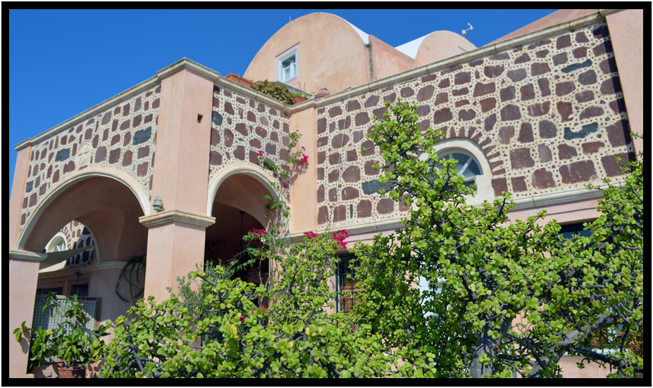 This inn has a unique stonework fascade, Oia, Santorini, Greece, 2013.