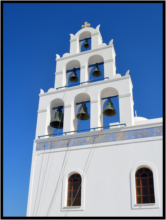 Detail of belltower of Newer Church of Panagia Platsani, Oia, Santorini, Greece, 2013.