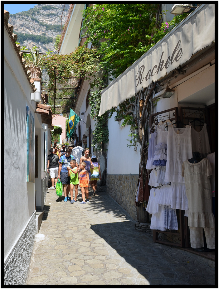 Narrow pedestrian shopping street, Positano, Campania, Italy, 2013.