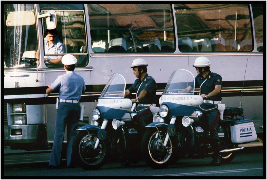 Police with tourist bus, Sorrento, Campania, Italy, 1978.