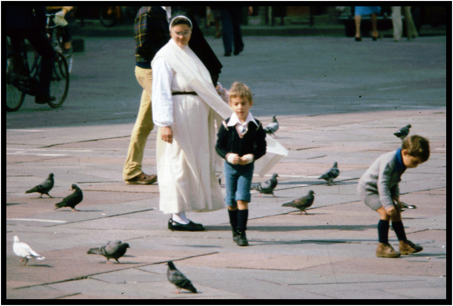 A nun watches the children feed the pigeons, Bologna, Emilia-Romagna, Italy, 1978.