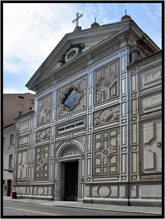 Nice clean marble facade of the Santa Teresa del Bambin Gesu, Parma, Emilia-Romagna, Italy, 2017.