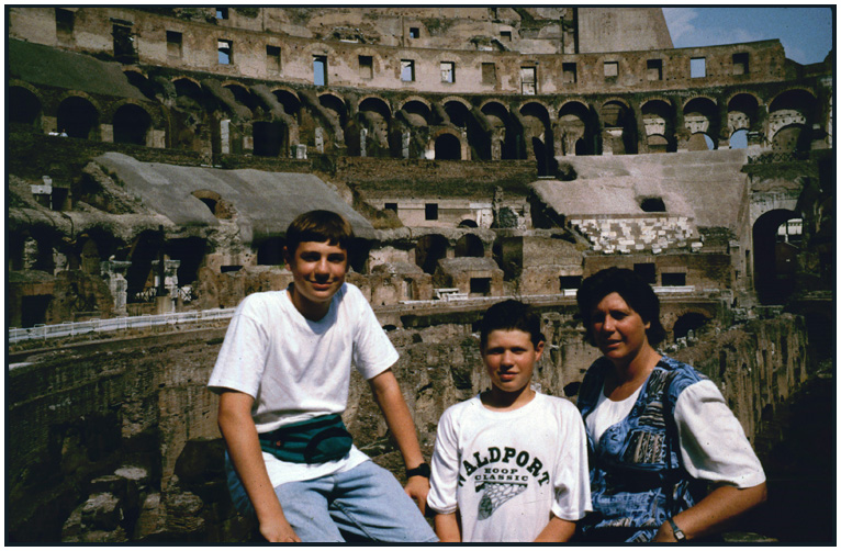 Son, Wyatt, and the old man getting whiter, Colosseum, Rome, Lazio, Italy, 1999.