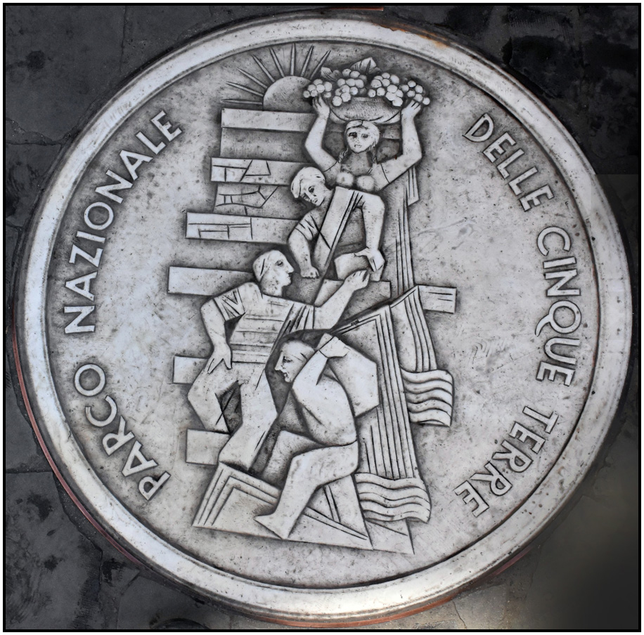 The Cinque Terre National Park plaque is set into the platform that divides the town, Manarola, Cinque Terre, Liguria, Italy, 2017.