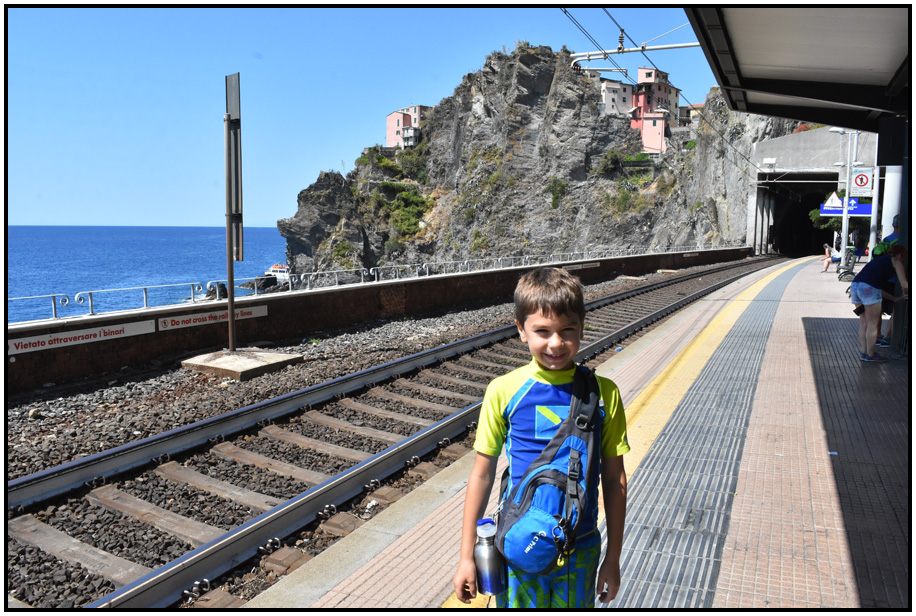A happy Alex at the train station with the tunnel beyond, Manarola, Cinque Terre, Liguria, Italy, 2017.