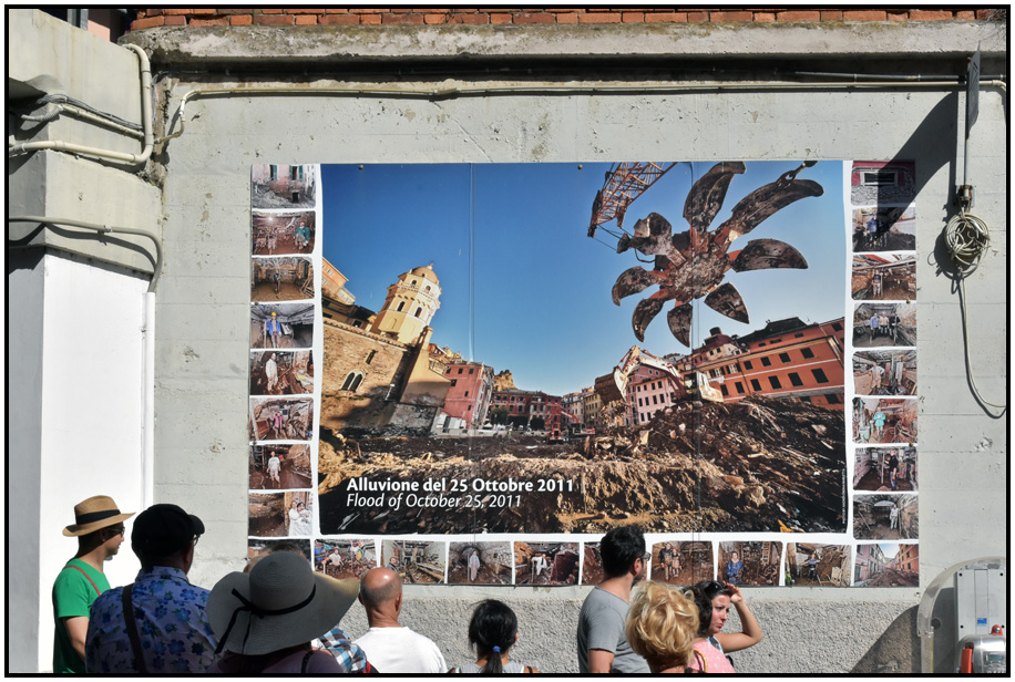 This sign illustrates the big flood of October 2011 which devastated the main street of Vernazza, Cinque Terre, Liguria, Italy, 2017.