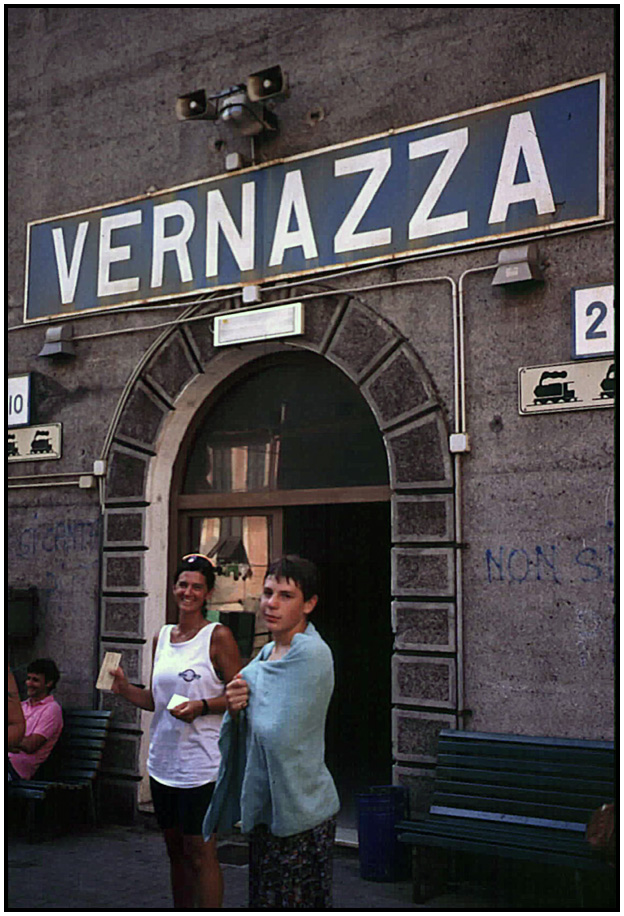 Rose Rahn and Wyatt at the train station, Vernazza, Cinque Terre, Liguria, Italy, 1994.