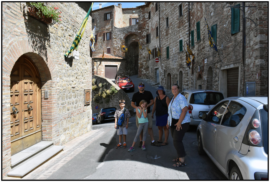 Family outside one of the city gates, Via del Paolino, Montepulciano, Tuscany, Italy, 2017.