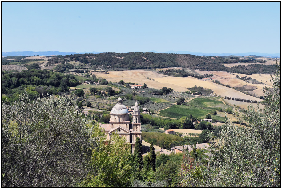 View northwest of town with the Chiesa di San Biagio below, Montepulciano, Tuscany, Italy, 2017.