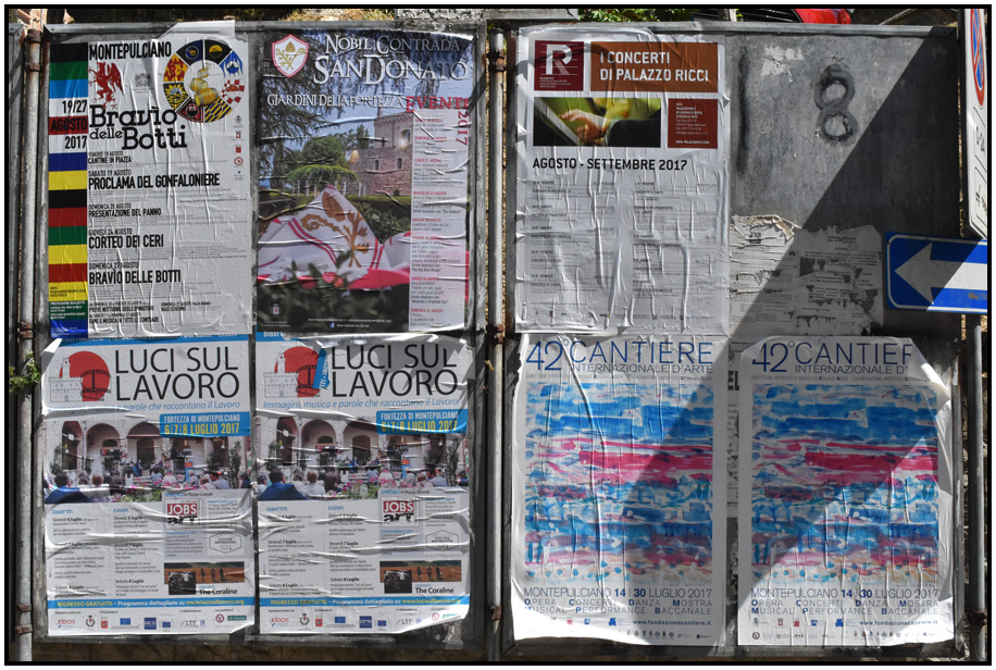 Wall posters outline local events, Montepulciano, Tuscany, Italy, 2017.