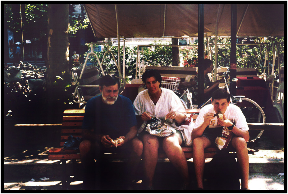 Lynn, Wyatt, and I enjoying a picnic lunch, Lido Isle, Veneto, Italy, 1994.