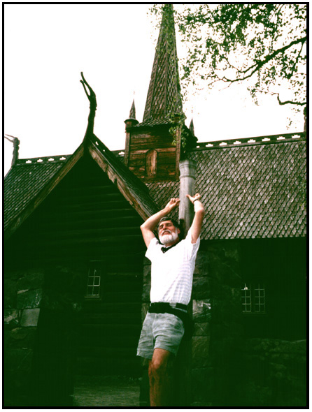 Trying out the whipping post outside the Garmokirken, Maihaugen, Lillehammer, Norway, 1994.