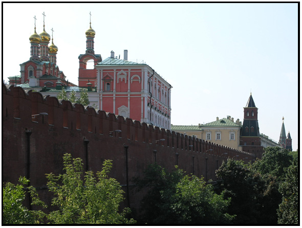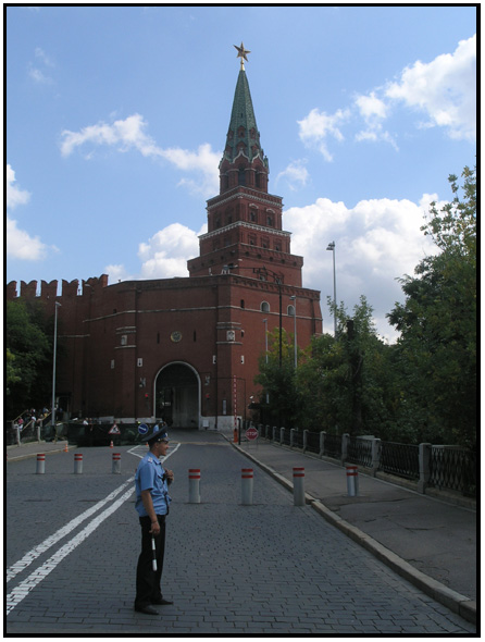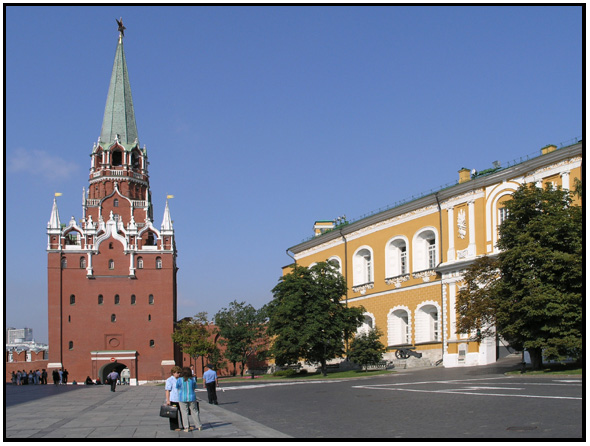 (Left to Right)Inside the Troitskaya Tower gate next to the Arsenal, the wall, and the Borovitskaja tower gate, Moscow, Russia, 2009.