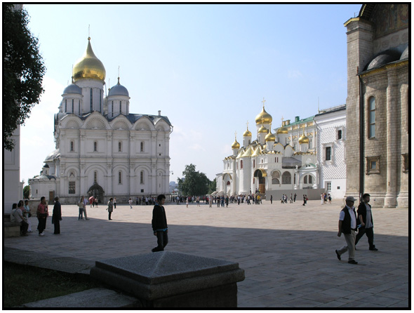 (Left) Sobornaya Square, or Cathedral Square with the Archangel Cathedral (1505-1508) by Italian architect Aleviz Fryazin Noviy on the left with the Cathedral of the Annunciation to it's right, 2009.