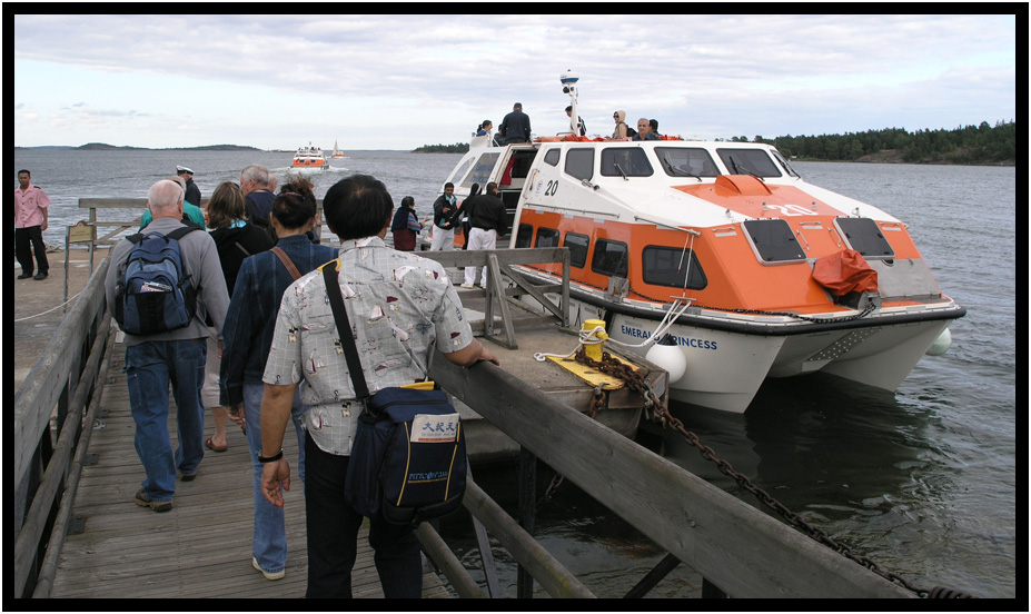 Boarding the cruise ship tenders to return to the ship, Nynashamn, Sweden, 2009.