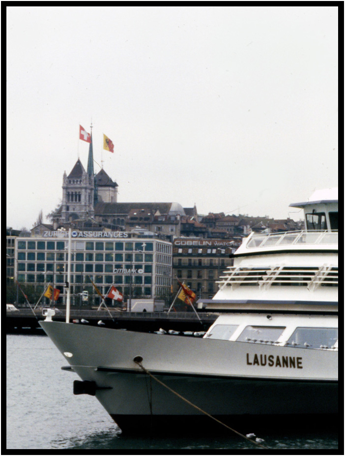 The Cathedrale Sainte Pierre on the hill beyond the harbor, Lake Geneva, Geneva, Switzerland, 1991.