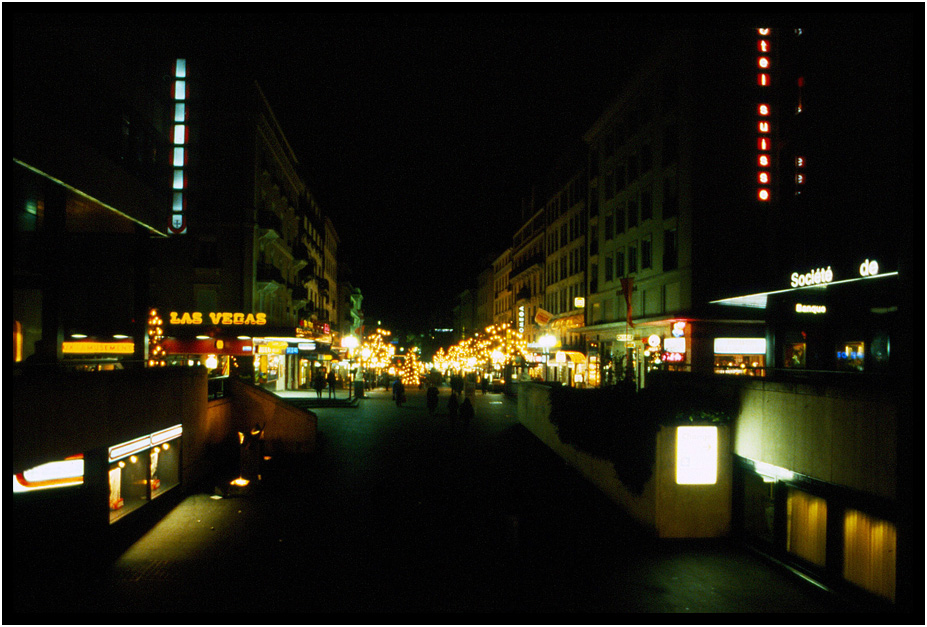 Night lights on the Rue du Mont Blanc, Geneva, Switzerland, 1991.