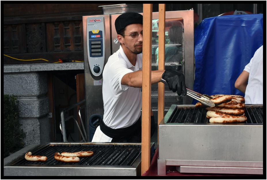 Roasting bratwurst, Unspunnenfest, Interlaken, Switzerland, 2017.