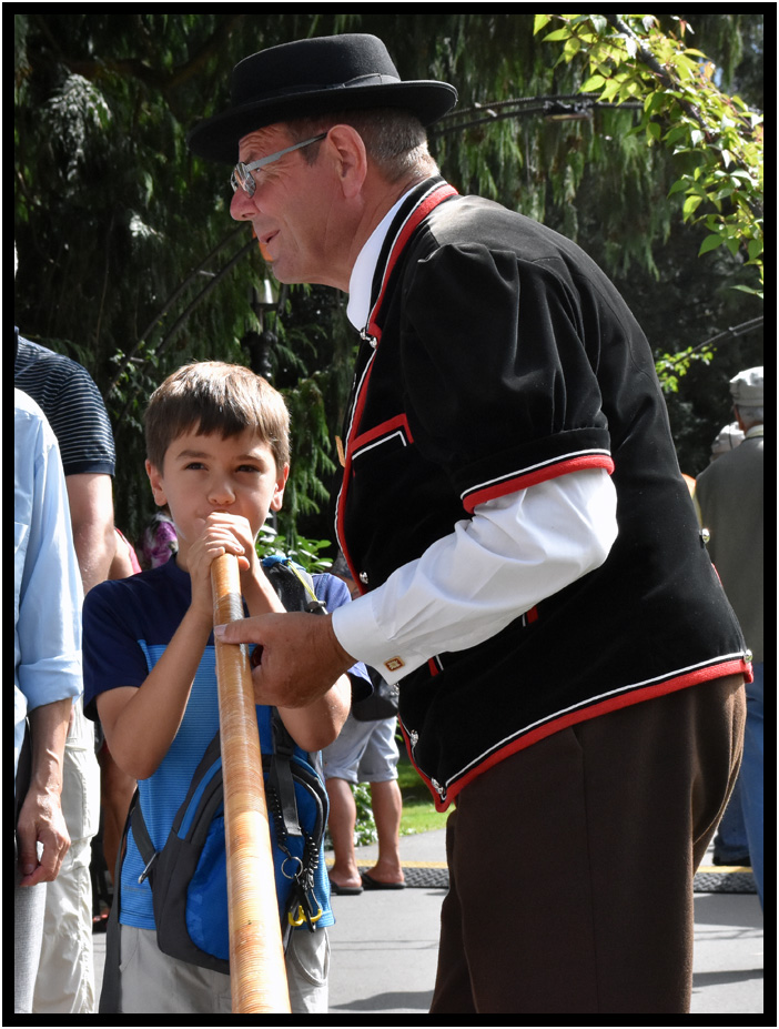Alex and Justice learning about the alpine horn, Unspunnenfests, Interlaken, Switzerland, 2017.