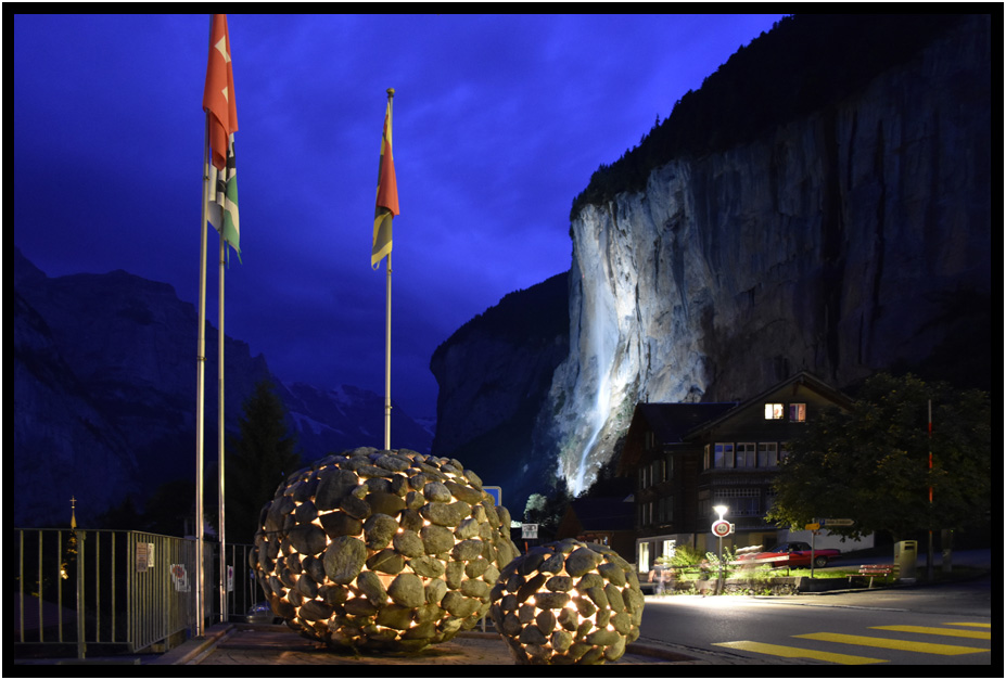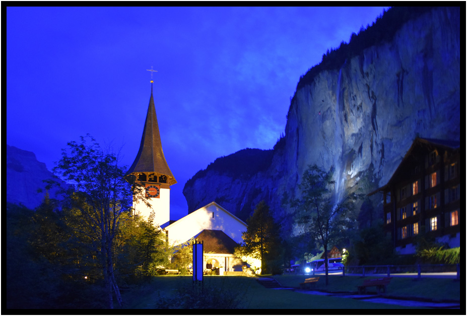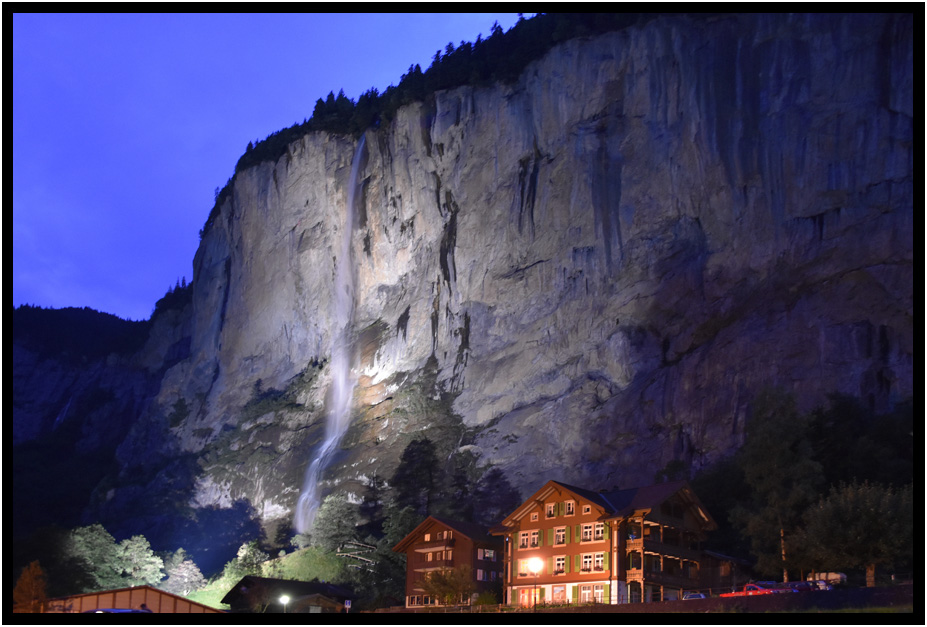 Lauterbrunnen at night has much to look at as many of the villages features are dramatically lit.