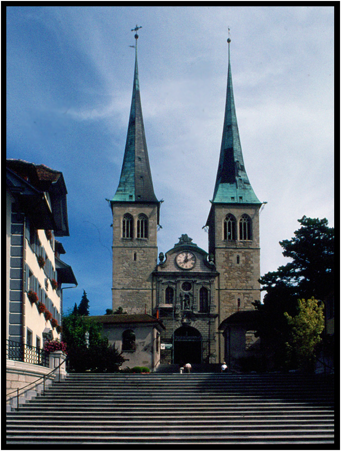 The famouos twin spires of Church of St. Leodegar (1633), also called the Hofkirche, a landmark in Lucerne, Switzerland, 1978.
