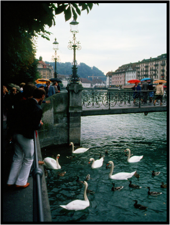 Feeding the swans is a favorite pastime along the lake and riverfronts, Lucerne, Switzerland, 1978.