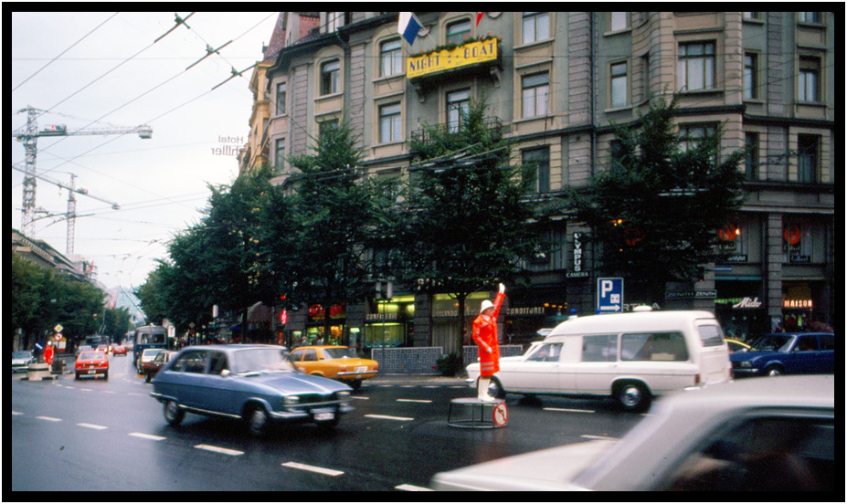 Colorful traffic director in the rain, Lucerne, Switzerland, 1978.