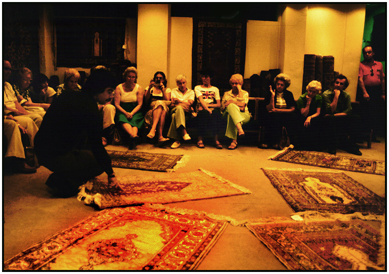 Every tours stops at a Turkish rug dealer for a lecture and sales talk, Istanbul, Turkey, 1978.
