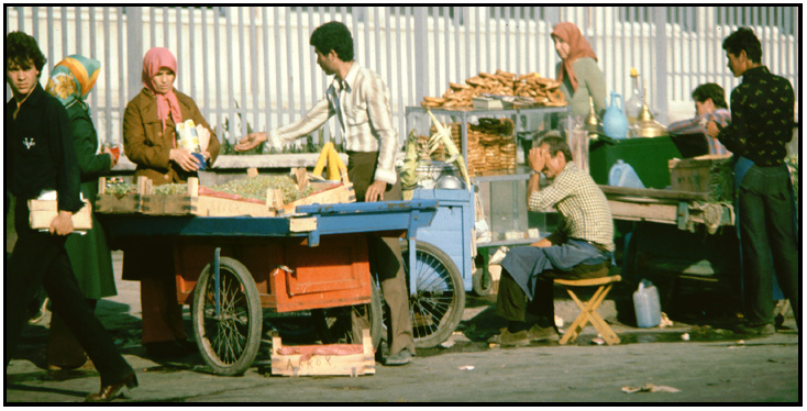 Street vendors selling vegetables from their carts, Instanbul, Turkey, 1978.