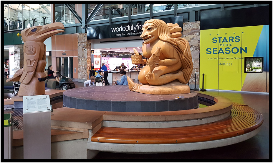 First Nation sculpture of "Fog Woman and Raven," by Dempsey Bob, Vancouver International Airport, Vancouver, British Colubia, Canada, 2019.